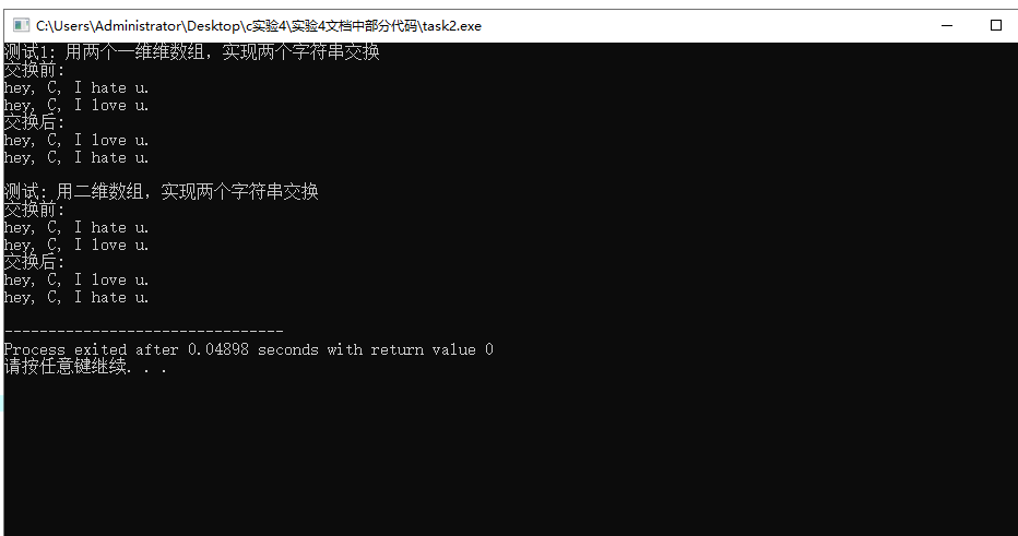 #include <stdio.h> #include <string.h> #define N 80 void swap_str(char s1[N], char s2[N]); void test1(); void test2(); int main() { printf("测试1: 用两个一维维数组,实现两个字符串交换\n"); test1(); printf("\n测试: 用二维数组,实现两个字符串交换\n"); test2(); return 0; } void test1() { char views1[N] = "hey, C, I hate u."; char views2[N] = "hey, C, I love u."; printf("交换前: \n"); puts(views1); puts(views2); swap_str(views1, views2); printf("交换后: \n"); puts(views1); puts(views2); } void test2() { char views[2][N] = {"hey, C, I hate u.", "hey, C, I love u."}; printf("交换前: \n"); puts(views[0]); puts(views[1]); swap_str(views[0], views[1]); printf("交换后: \n"); puts(views[0]); puts(views[1]); } void swap_str(char s1[N], char s2[N]) { char tmp[N]; strcpy(tmp, s1); strcpy(s1, s2); strcpy(s2, tmp); }