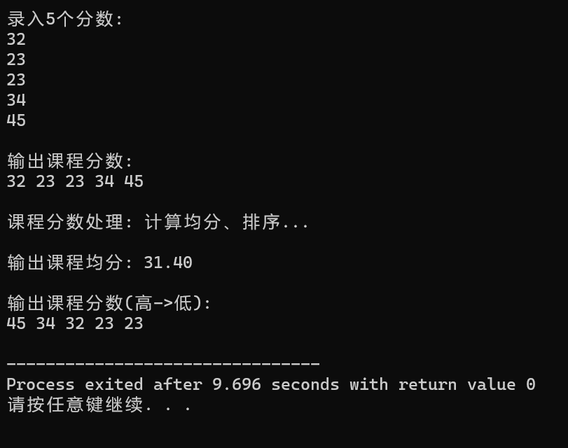 #include <stdio.h> #define N 5 void input(int x[], int n); void output(int x[], int n); double average(int x[], int n); void bubble_sort(int x[], int n); int main() { int scores[N]; double ave; printf("录入%d个分数:\n", N); input(scores, N); printf("\n输出课程分数: \n"); output(scores, N); printf("\n课程分数处理: 计算均分、排序...\n"); ave = average(scores, N); bubble_sort(scores, N); printf("\n输出课程均分: %.2f\n", ave); printf("\n输出课程分数(高->低):\n"); output(scores, N); return 0; } void input(int x[], int n) { int i; for(i = 0; i < n; ++i) scanf("%d", &x[i]); } void output(int x[], int n) { int i; for(i = 0; i < n; ++i) printf("%d ", x[i]); printf("\n"); } double average(int x[], int n){ double a=0; int i; for(i = 0;i < n;i++) a+=x[i]; return a/n; } void bubble_sort(int x[], int n){ int i,j,t; for(i=0;i<n-1;i++) for(j=0;j<n-1-i;j++) if(x[j]<x[j+1]){ t=x[j]; x[j]=x[j+1]; x[j+1]=t; } }