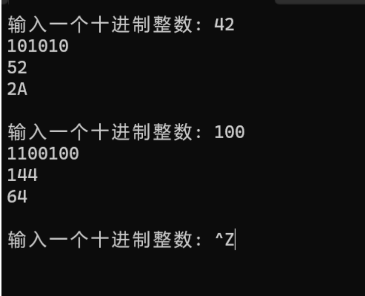 #include <stdio.h> #define N 100 void dec2n(int x, int n); int main() { int x; printf("输入一个十进制整数: "); while(scanf("%d", &x) != EOF) { dec2n(x, 2); dec2n(x, 8); dec2n(x, 16); printf("\n输入一个十进制整数: "); } return 0; } void dec2n(int x, int n){ char a[100]; int i=0,j=0; while(x>=n){ if(x%n<=9) a[j++]=x%n+48; else a[j++]=x%n-10+'A'; x/=n; } if(x<=9) a[j]=x+'0'; else a[j]=x-10+'A'; for(i=j;i>=0;i--) { printf("%c",a[i]); } printf("\n"); }