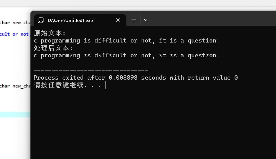 #include <stdio.h> #define N 80 void replace(char x[], char old_char, char new_char); int main() { char text[N] = "c programming is difficult or not, it is a question."; printf("原始文本: \n"); printf("%s\n", text); replace(text, 'i', '*'); printf("处理后文本: \n"); printf("%s\n", text); return 0; } void replace(char x[], char old_char, char new_char) { int i; for (i = 0; x[i] != '\0'; ++i) if (x[i] == old_char) x[i] = new_char; }
