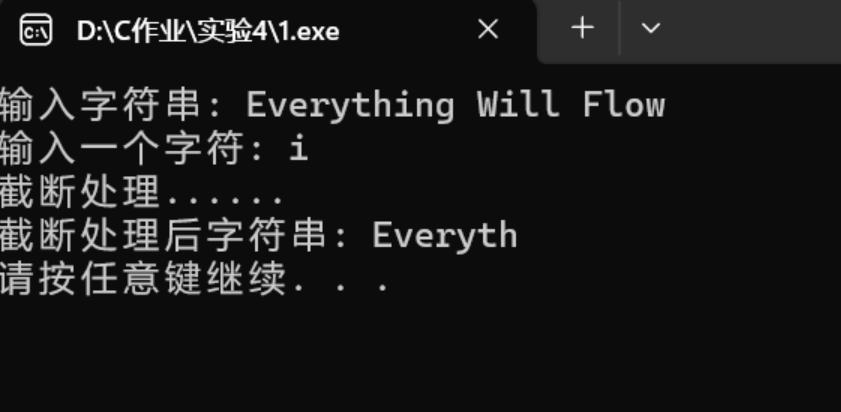 #include <stdio.h> #include<stdlib.h> #define N 80 int main() { char str[N], ch; int i; printf("输入字符串: "); gets(str); printf("输入一个字符: "); ch = getchar(); printf("截断处理......"); i = 0; while (str[i] != '\0') { if (str[i] == ch){ str[i+1]='\0'; break;} i++; } str[i] ='\0' ; printf("\n截断处理后字符串: %s\n", str); system("pause"); return 0; }