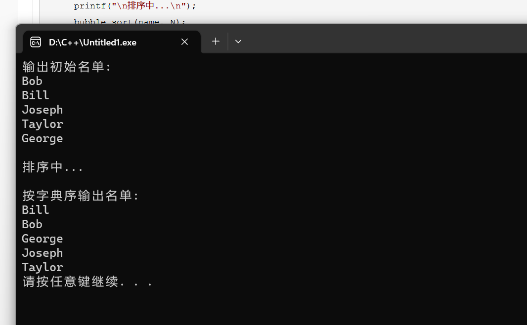 #include <stdio.h> #include<stdlib.h> #include <string.h> #define N 5 #define M 20 void bubble_sort(char str[][M], int n); int main() { char name[][M] = {"Bob", "Bill", "Joseph", "Taylor", "George"}; int i; printf("输出初始名单:\n"); for (i = 0; i < N; i++) printf("%s\n", name[i]); printf("\n排序中...\n"); bubble_sort(name, N); printf("\n按字典序输出名单:\n"); for (i = 0; i < N; i++) printf("%s\n", name[i]); system("pause"); return 0; } void bubble_sort(char str[][M], int n){ int i,j; char k[M]; for(i=0;i<5;i++) for(j=0;j<n-i-1;j++) if(strcmp(str[j],str[j+1])>0){ strcpy(k,str[j]); strcpy(str[j],str[j+1]); strcpy(str[j+1],k); } }