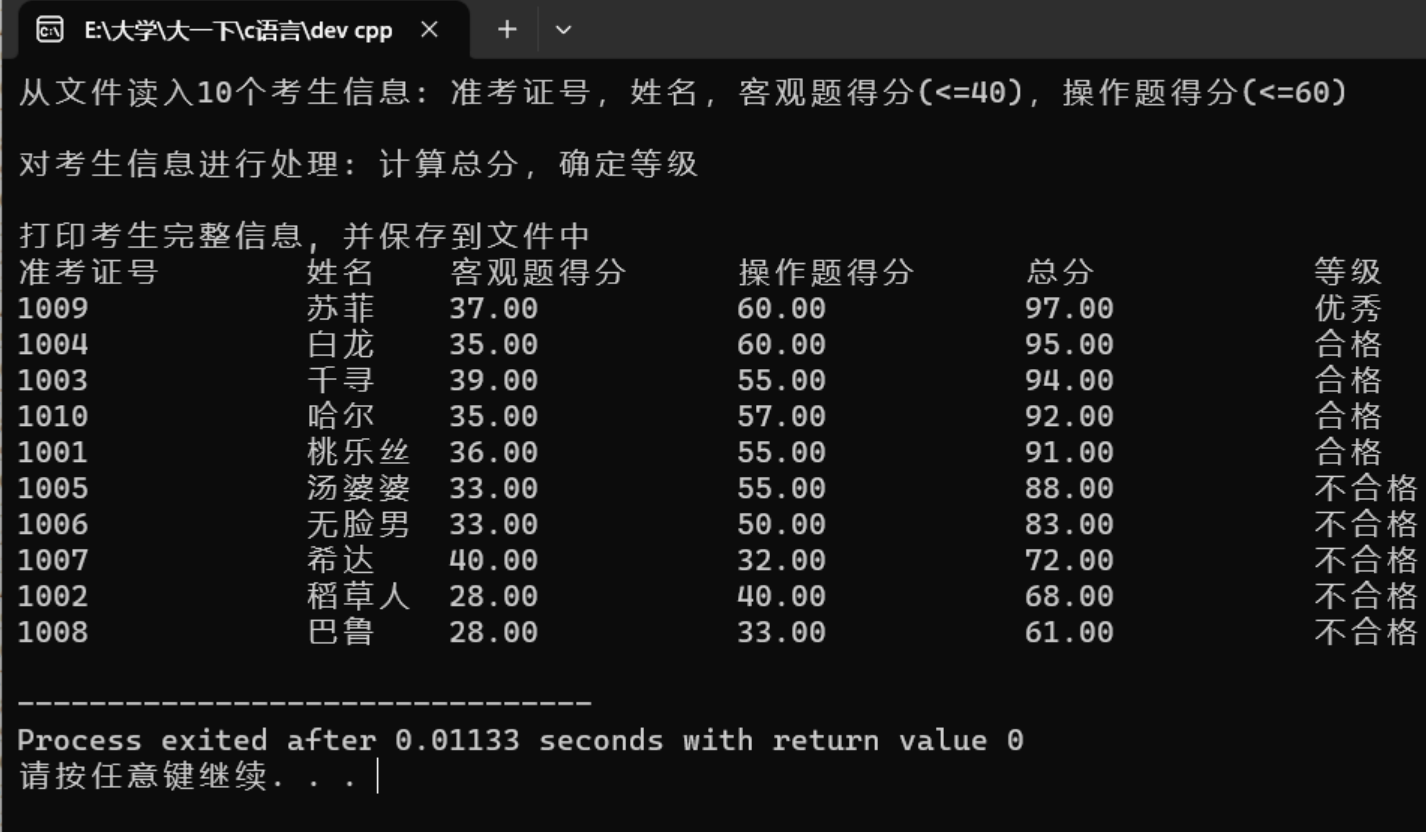 printf("准考证号\t姓名\t客观题得分\t操作题得分\t总分\t\t等级\n");