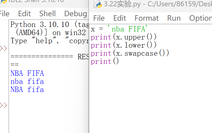 x = 'nba FIFA' print(x.upper()) print(x.lower()) print(x.swapcase()) print()
