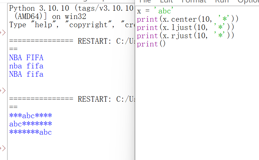 x = 'abc' print(x.center(10, '*')) print(x.ljust(10, '*')) print(x.rjust(10, '*')) print()