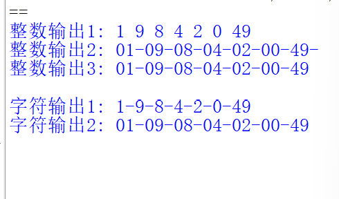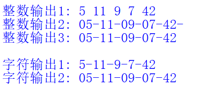 x = [5, 11, 9, 7, 42] print('整数输出1: ', end = '') i = 0 while i < len(x): print(x[i], end = ' ') i += 1 print('\n整数输出2: ', end = '') i = 0 while i < len(x): print(f'{x[i]:02d}', end = '-') i += 1 print('\n整数输出3: ', end = '') i = 0 while i < len(x) - 1: print(f'{x[i]:02d}', end = '-') i += 1 print(f'{x[-1]:02d}') print('\n字符输出1: ', end = '') y1 = [] i = 0 while i < len(x): y1.append(str(x[i])) i += 1 print('-'.join(y1)) print('字符输出2: ', end = '') y2 = [] i = 0 while i < len(x): y2.append( str(x[i]).zfill(2) ) i += 1 print('-'.join(y2))