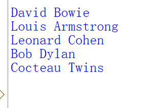 name_list = ['david bowie', 'louis armstrong', 'leonard cohen', 'bob dylan', 'cocteau twins'] i = 0 while i < len(name_list): print(name_list[i].title()) i += 1 print()