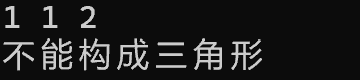 #include <stdio.h> int main() { double a, b, c; scanf("%lf%lf%lf", &a, &b, &c); if(a+b>c&&a+c>b&&b+c>a) printf("能构成三角形\n"); else printf("不能构成三角形\n"); return 0; }