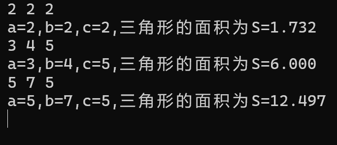 #include <stdio.h> #include <math.h> int main() { double a,b,c,s,area; while(scanf("%lf %lf %lf", &a,&b,&c) != EOF) { s=(a+b+c)/2; area=sqrt(s * (s - a) * (s - b) * (s - c)); printf("a=%.0f,b=%.0f,c=%.0f,三角形的面积为S=%.3f",a,b,c,area); printf("\n"); } return 0; }
