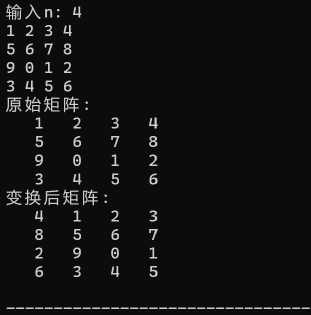 #include <stdio.h> #define N 100 void input(int x[][N], int n); void output(int x[][N], int n); void rotate_to_right(int x[][N], int n); int main() { int x[N][N]; int n; printf("输入n: "); scanf("%d", &n); input(x, n); printf("原始矩阵:\n"); output(x, n); rotate_to_right(x, n); printf("变换后矩阵:\n"); output(x, n); return 0; } void input(int x[][N], int n) { int i,j; for (i = 0; i < n; ++i) { for (j = 0; j < n; ++j) scanf("%d", &x[i][j]); } } void output(int x[][N], int n) { int i,j; for (i = 0; i < n; ++i) { for (j = 0; j < n; ++j) printf("%4d", x[i][j]); printf("\n"); } } void rotate_to_right(int x[][N], int n) { int temp[N][N]; int i,j,o,p,k; for(k=0;k<n;++k) { temp[k][0]=x[k][n-1]; } for(j=1;j<n;++j) { for(i=0;i<n;++i) { temp[i][j]=x[i][j-1]; } } for( o=0;o<n;++o) { for( p=0;p<n;++p) { x[p][o]=temp[p][o]; } } }