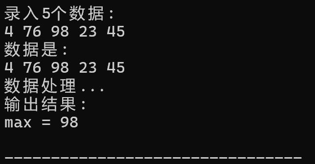 #include <stdio.h> #define N 5 void input(int x[], int n); void output(int x[], int n); int *find_max(int x[], int n); int main() { int a[N]; int *pmax; printf("录入%d个数据:\n", N); input(a, N); printf("数据是: \n"); output(a, N); printf("数据处理...\n"); pmax = find_max(a, N); printf("输出结果:\n"); printf("max = %d\n", *pmax); return 0; } void input(int x[], int n) { int i; for(i = 0; i < n; ++i) scanf("%d", &x[i]); } void output(int x[], int n) { int i; for(i = 0; i < n; ++i) printf("%d ", x[i]); printf("\n"); } int *find_max(int x[], int n) { int max_index = 0; int i; for(i = 0; i < n; ++i) if(x[i] > x[max_index]) max_index = i; return &x[max_index]; }