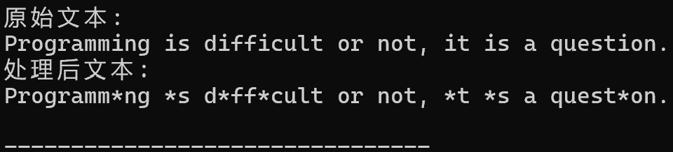 #include <stdio.h> #define N 80 void replace(char *str, char old_char, char new_char); int main() { char text[N] = "Programming is difficult or not, it is a question."; printf("原始文本: \n"); printf("%s\n", text); replace(text, 'i', '*'); printf("处理后文本: \n"); printf("%s\n", text); return 0; } void replace(char *str, char old_char, char new_char) { int i; while(*str) { if(*str == old_char) *str = new_char; str++; } }