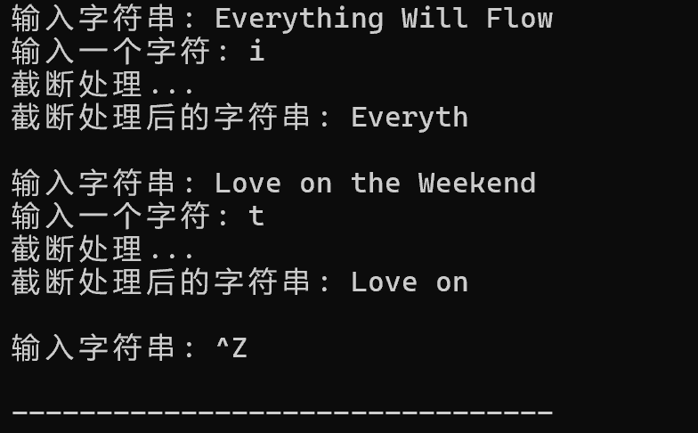 #include <stdio.h> #define N 80 char *str_trunc(char *str, char x); int main() { char str[N]; char ch; while(printf("输入字符串: "), gets(str) != NULL) { printf("输入一个字符: "); ch = getchar(); printf("截断处理...\n"); str_trunc(str, ch); printf("截断处理后的字符串: %s\n\n", str); getchar(); } return 0; } char *str_trunc(char *str, char x) { char *p=str; while(*p!='\0') { if(*p==x) { *p='\0'; break; } p++; } return str; }