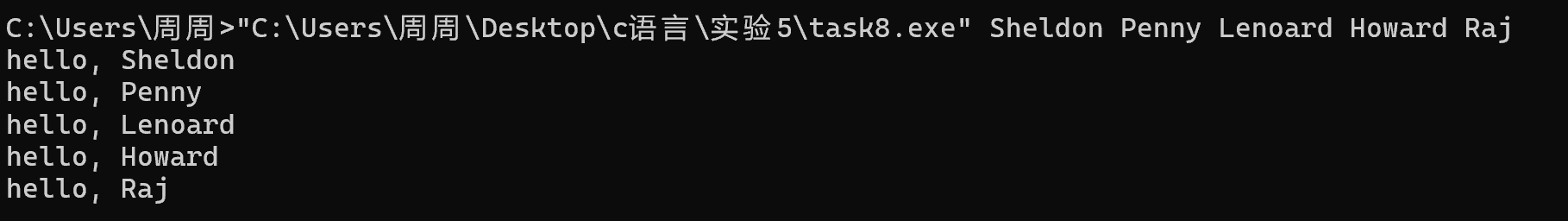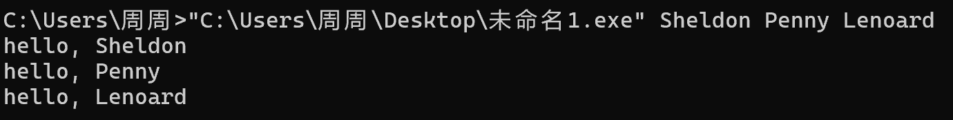 #include <stdio.h> int main(int argc, char *argv[]) { int i; for(i = 1; i < argc; ++i) printf("hello, %s\n", argv[i]); return 0; }