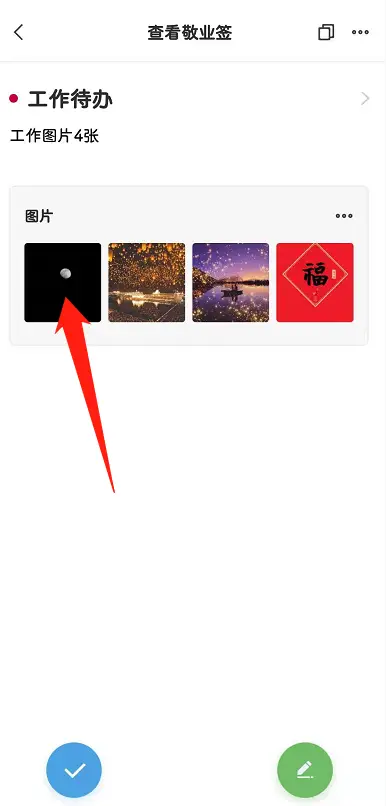 2、在查看单条敬业签页面的附件编辑框中,找到需要保存的那张图片点击并长按。