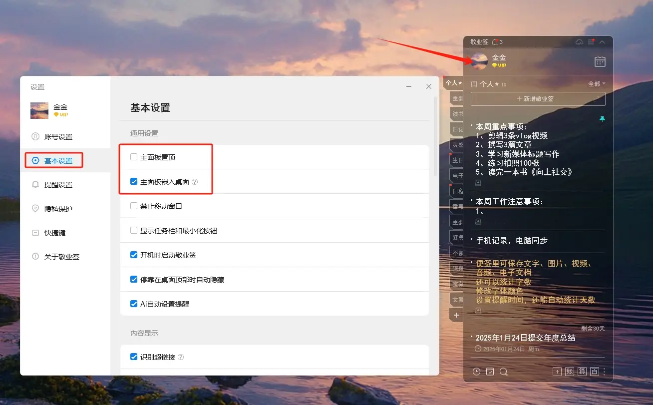 在基本设置中,勾选“主面板置顶”,界面就会在桌面上置顶显示,不会被其他页面遮挡;勾选“主面板嵌入桌面”,界面就会嵌入桌面,用Win+D一键返回桌面,它也不会消失。
