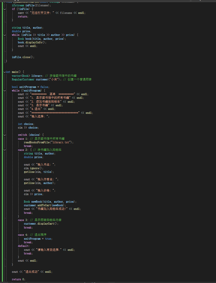 readBooksFromFile 中的文件读取逻辑可以改进,尤其是考虑到书名和作者有可能包含空格。此外,当前的文件读取方式不适合处理带有空格的书名或作者。可以使用 getline 来读取完整的书名和作者。
