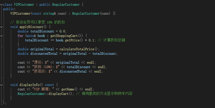 使用继承而不是组合:通过继承 RegularCustomer,VIPCustomer 可以直接使用购物车(getShoppingCart()),而不需要重新定义它。