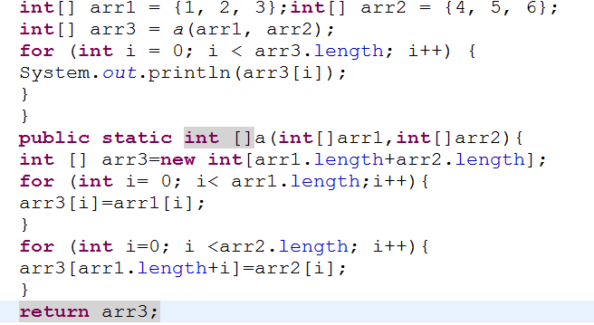 2.要求定义一个方法,将上面两个数组传入,在方法中将两个数组合并,形成一个新的数组,并返回.