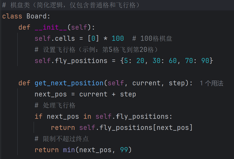 其中的get_next_position 方法负责计算移动后的位置,优先处理飞行跳跃格,再限制不超过终点