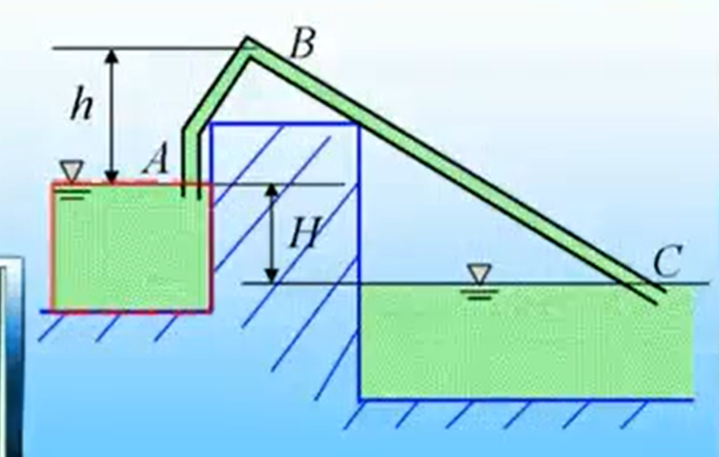 求:(1)流经虹吸管的流量;(2)如虹吸管顶部B点安装高度h=4.5m,计算其压强。