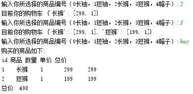 choice = input("输入你所选择的商品编号(0长袖,1短袖,2长裤,3短裤,4帽子):").strip()