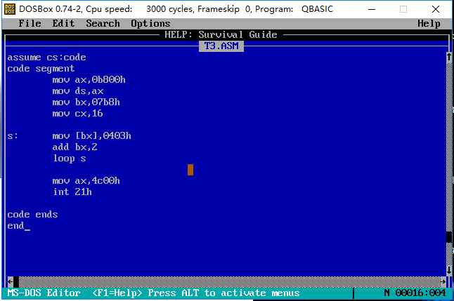 1. 综合使用 loop,[bx],编写完整汇编程序,实现向内存 b800:07b8 开始的连续 16 个 字单元重复填充字数据 0403H。