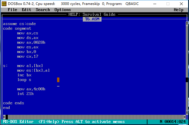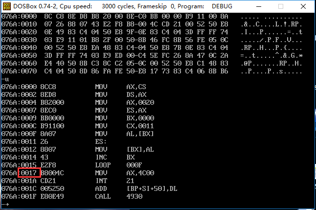 因为 mov ax,4c00h前指令所占17个字节 所以 mov cx,17。