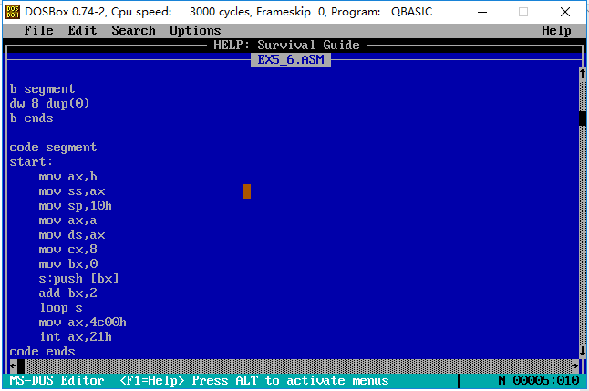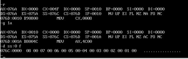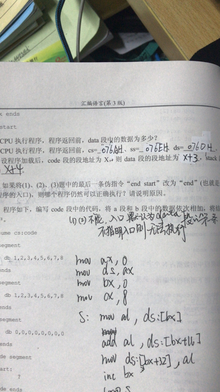 (6)编写code段中的代码,用push指令将a段中的前8个字型数据,逆序存储到b段中。