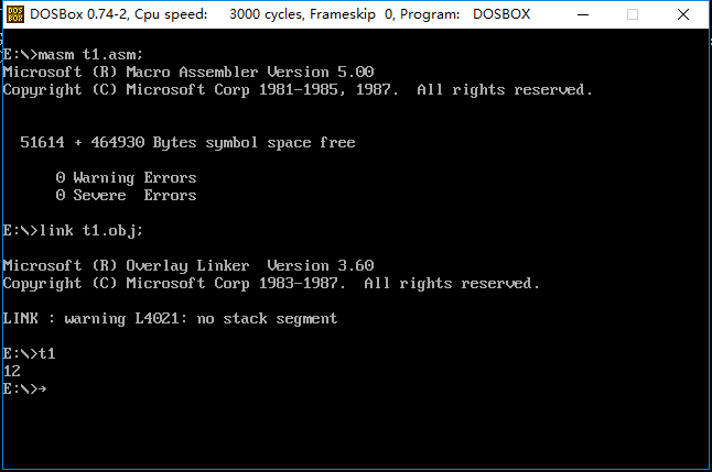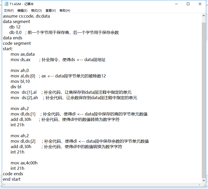 1. 补全程序t1.asm,完成在屏幕上输出内存单元中的十进制两位数