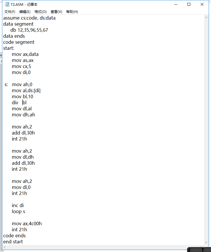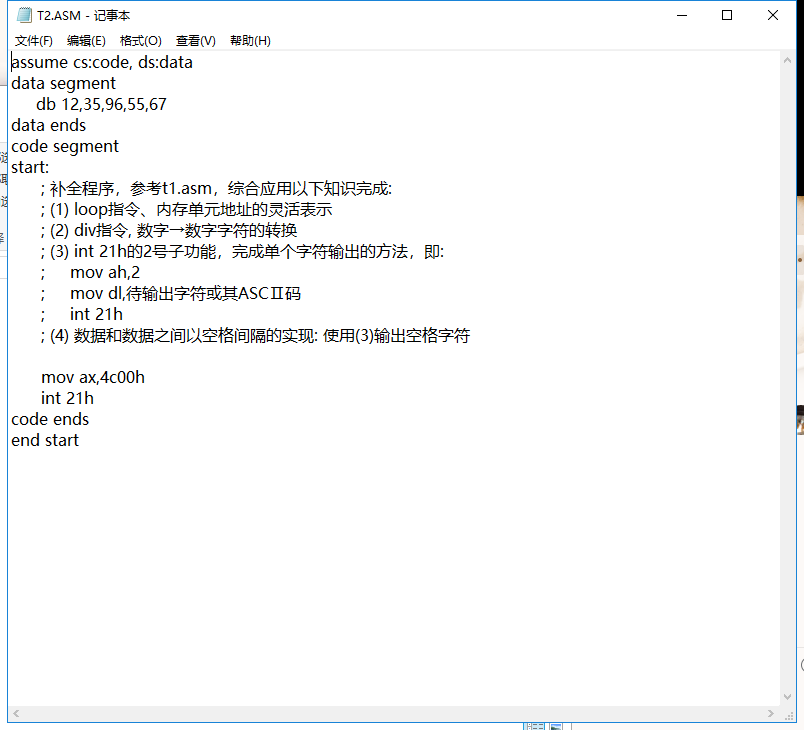 2. 补全程序t2.asm,完成在屏幕上输出data段定义的5个十进制两位数,数据和数据 之间以空格间隔。