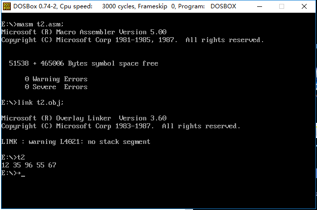 补全程序 t2.asm,完成在屏幕上输出 data 段定义的 5 个十进制两位数,数据和数据 之间以空格间隔。