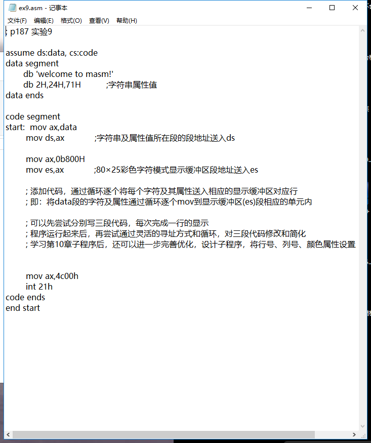 1. 复习数值和数字字符之间的转换方法,div指令用法 2. 学习P187-189支撑材料及「实验9提示」(本文档最后一部分) 3. 复习灵活的寻址方式及本次实验中用到的指令,如mov, loop,div等。
