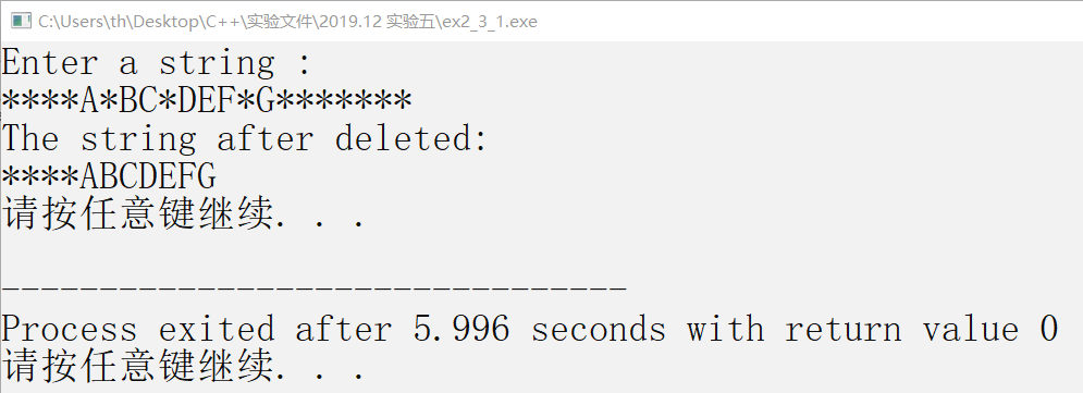 /* 假定输入的字符串中只包含字母和*号。 编写函数,实现: 除了字符串前导的*号之外,将串中其他*号全部删除。 在编写函数时,不得使用C语言提供的字符串函数。 例如,若字符串中的内容为****A*BC*DEF*G******* 删除后,字符串中的内容则应当是****ABCDEFG */ #include <string.h> #include <stdio.h> #include <stdlib.h> void fun(char *a) { /*****ERROR********/ int i=0; char *p = a; /****ERROR***/ while(*p && *p == '*') { a[i] = *p; i++; p++; } while(*p) { /******ERROR*******/ if(*p != '*') { a[i] = *p; i++; } p++; } /******ERROR*******/ a[i] = 0; } int main() { char s[81]; printf("Enter a string :\n"); gets(s); /***ERROR******/ fun(s); printf("The string after deleted:\n"); puts(s); system("pause"); return 0; }