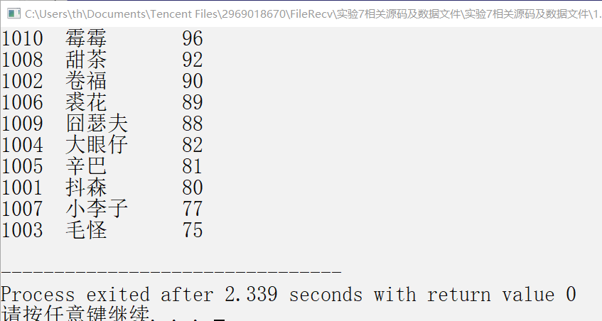 #include <stdio.h> #include <stdlib.h> #define N 10 // 定义一个结构体类型STU typedef struct student { int num; char name[20]; int score; }STU; int main() { FILE *fin; STU st[N]; int i; // 以只读文本方式打开二进制文件file4.dat fin = fopen("file4.dat", "rb"); if( !fin ) { // 如果打开失败,则输出错误提示信息,然后退出程序 printf("fail to open file4.dat\n"); exit(0); } // 从fin指向的数据文件file4.dat中读取数据到结构体数组st for(i=0; i<N; i++) fread(&st,sizeof(STU),N,fin); // 将数组st中数据输出到屏幕 for(i=0; i<N; i++) printf("%-6d%-10s%3d\n", st[i].num, st[i].name, st[i].score); return 0; }