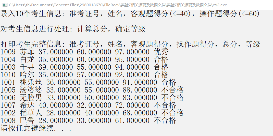 #include <stdio.h> #include <stdlib.h> #include <string.h> const int N = 10; // 定义结构体类型struct student,并定义其别名为STU typedef struct student { long int id; char name[20]; float objective; /*客观题得分*/ float subjective; /*操作题得分*/ float sum; char level[10]; }STU; // 函数声明 void input(STU s[], int n); void output(STU s[], int n); void process(STU s[], int n); int main() { STU stu[N]; printf("录入%d个考生信息: 准考证号,姓名,客观题得分(<=40),操作题得分(<=60)\n", N); input(stu, N); printf("\n对考生信息进行处理: 计算总分,确定等级\n"); process(stu, N); printf("\n打印考生完整信息: 准考证号,姓名,客观题得分,操作题得分,总分,等级\n"); output(stu, N); system("pause"); return 0; } // 从文本文件examinee.txt读入考生信息:准考证号,姓名,客观题得分,操作题得分 void input(STU s[], int n) { // 补足代码 // ××× FILE *fp1; int i; fp1=fopen("examinee.txt","r"); if(!fp1) { printf("fail to open examinee.txt\n"); exit(0); } for(i=0;i<n;i++) fscanf(fp1, "%ld %s %f %f",&s[i].id,&s[i].name,&s[i].objective,&s[i].subjective); fclose(fp1); } // 输出考生完整信息: 准考证号,姓名,客观题得分,操作题得分,总分,等级 // 不仅输出到屏幕上,还写到文本文件result.txt中 void output(STU s[], int n) { // 补足代码 // ××× int i; FILE *fp2; fp2=fopen("result.txt","w"); for(i=0;i<n;i++){ printf("%ld %s %f %f %f %s\n",s[i].id,s[i].name,s[i].objective,s[i].subjective,s[i].sum,s[i].level); fprintf(fp2,"%ld %s %f %f %f %s\n",s[i].id,s[i].name,s[i].objective,s[i].subjective,s[i].sum,s[i].level); } fclose(fp2); } // 对考生信息进行处理:计算总分,排序,确定等级 void process(STU s[], int n) { // 补足代码 // ××× int i,j,k; STU m; for(i=0;i<n;i++) s[i].sum=s[i].objective+s[i].subjective; for(k=0;k<n-1;k++) { for(j=0;j<n-1-k;j++) if(s[j].sum<s[j+1].sum) { m = s[j]; s[j] = s[j+1]; s[j+1] = m; } } for(i=0;i<n;i++) { switch(i) { case 0:strcpy(s[i].level,"优秀");break; case 1: case 2: case 3: case 4:strcpy(s[i].level,"合格");break; case 5: case 6: case 7: case 8: case 9:strcpy(s[i].level,"不合格");break; } } }