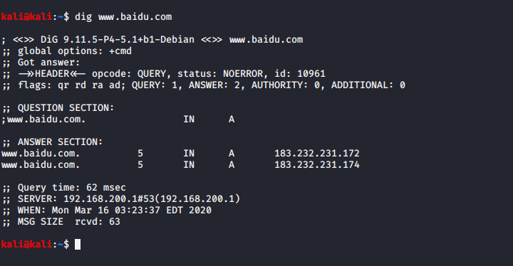 或者使用dig客户端程序查询域名映射IP地址: