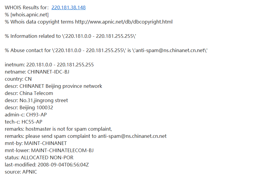 利用站长之家whois查询IP注册信息: