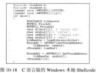 使用LoadLibrary()函数加载msvcrt.dll动态链接库,并通过GetprocAddress()函数获得system函数的加载入口地址,赋值给ProAdd函数指针;然后通过函数指针调用system()函数,启动Shell;最后,Shellcode调用函数exit()退出当前进程。