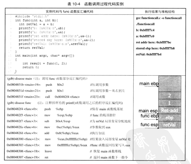 main函数中进行了func函数调用,对调用参数压栈并通过call指令再保存返回地址后跳转到func函数;func函数中,前3条指令构建栈结构,在完成函数功能(这里为对参数求和)后,最后两条指令回复main函数的堆栈并返回下一条指令继续运行。