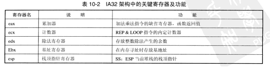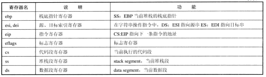 (2)汇编语言基础知识:尤其是IA32 (Intel 32位)架构下的汇编语言是掌握软件渗透攻击代码技术的底层基础。在IA32汇编语言中,从应用的角度将寄存器分为4类,即
