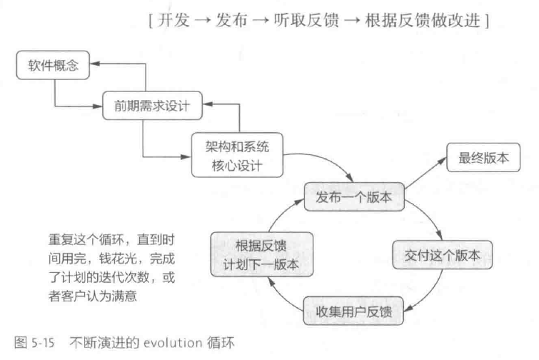 - 概述:接近近迭代式开发流程,当系统的主要需求和架构明确之后,软件团队进入一个不断演进的循环中。