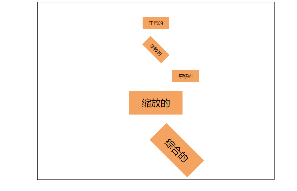 <!DOCTYPE html> <html lang="en"> <head> <meta charset="UTF-8"> <title>Title</title> <style> *{ margin: 0; padding: 0; } ul{ border: 1px solid #000; width: 800px; height: 600px; list-style: none; margin: 0 auto; } li{ text-align: center; line-height: 40px; width: 90px; background-color: sandybrown; margin: 0 auto; margin-top: 50px; } li:nth-of-type(2){ /*旋转45度,默认以元素左上角为中心点旋转*/ transform:rotate(45deg); /*自定义旋转中心点,取值: transform-origin: center center; transform-origin: 0px 0px; transform-origin: left bottom; transform-origin: 10% 20%;*/ transform-origin: right top; } li:nth-of-type(3){ /*向右平移100px 垂直方向不动*/ transform: translate(100px,0px); } li:nth-of-type(4){ /*横向放大2倍,竖向放大2倍,默认取值为1,没有变化, 取值小于1表示缩小,如果两个取值一样就可以简写为一个数字*/ transform:scale(2,2); } li:nth-of-type(5){ /*如果有多个转换模块,可以连写,空格隔开即可*/ transform: rotate(45deg) translate(100px,0px) scale(2,2); } </style> </head> <body> <ul> <li>正常的</li> <li>旋转的</li> <li>平移的</li> <li>缩放的</li> <li>综合的</li> </ul> </body> </html>
