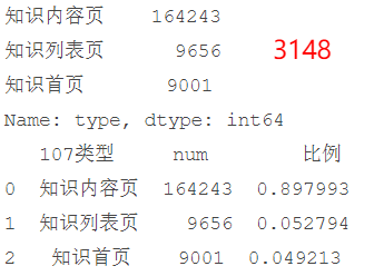 # 因为只有107001一类,但是可以继续细分成三类:知识内容页、知识列表页、知识首页 def count107(i): #自定义统计函数 j = i[['fullURL']][i['fullURLId'].str.contains('107')].copy() # 找出类别包含107的网址 j['type'] = None # 添加空列 j['type'][j['fullURL'].str.contains('info/.+?/')]= '知识首页' j['type'][j['fullURL'].str.contains('info/.+?/.+?')]= '知识列表页' j['type'][j['fullURL'].str.contains('/\d+?_*\d+?\.html')]= '知识内容页' return j['type'].value_counts() # 注意:获取一次sql对象就需要重新访问一下数据库(!!!) #engine = create_engine('mysql+pymysql://root:123456@127.0.0.1:3306/test?charset=utf8') sql = pd.read_sql('all_gzdata', engine, chunksize = 10000) counts2 = [count107(i) for i in sql] # 逐块统计 counts2 = pd.concat(counts2).groupby(level=0).sum() # 合并统计结果 print(counts2) #计算各个部分的占比 res107 = pd.DataFrame(counts2) # res107.reset_index(inplace=True) res107.index.name= '107类型' res107.rename(columns={'type':'num'}, inplace=True) res107['比例'] = res107['num'] / res107['num'].sum() res107.reset_index(inplace = True) print(res107)