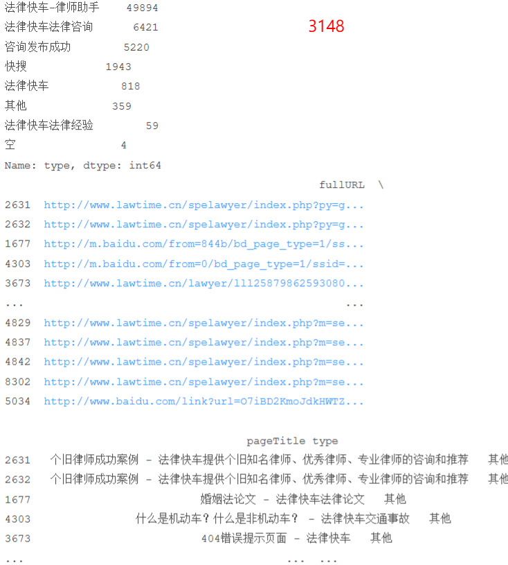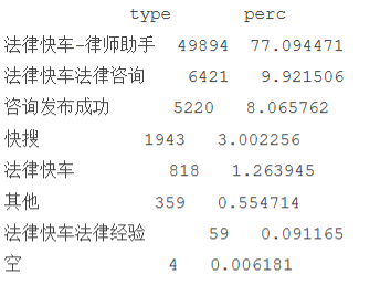 def page199(i): #自定义统计函数 j = i[['fullURL','pageTitle']][(i['fullURLId'].str.contains('199')) & (i['fullURL'].str.contains('\?'))] j['pageTitle'].fillna('空',inplace=True) j['type'] = '其他' # 添加空列 j['type'][j['pageTitle'].str.contains('法律快车-律师助手')]= '法律快车-律师助手' j['type'][j['pageTitle'].str.contains('咨询发布成功')]= '咨询发布成功' j['type'][j['pageTitle'].str.contains('免费发布法律咨询' )] = '免费发布法律咨询' j['type'][j['pageTitle'].str.contains('法律快搜')] = '快搜' j['type'][j['pageTitle'].str.contains('法律快车法律经验')] = '法律快车法律经验' j['type'][j['pageTitle'].str.contains('法律快车法律咨询')] = '法律快车法律咨询' j['type'][(j['pageTitle'].str.contains('_法律快车')) | (j['pageTitle'].str.contains('-法律快车'))] = '法律快车' j['type'][j['pageTitle'].str.contains('空')] = '空' return j # 注意:获取一次sql对象就需要重新访问一下数据库 #engine = create_engine('mysql+pymysql://root:123456@127.0.0.1:3306/test?charset=utf8') sql = pd.read_sql('all_gzdata', engine, chunksize = 10000)# 分块读取数据库信息 #sql = pd.read_sql_query('select * from all_gzdata limit 10000', con=engine) counts4 = [page199(i) for i in sql] # 逐块统计 counts4 = pd.concat(counts4) d1 = counts4['type'].value_counts() print(d1) d2 = counts4[counts4['type']=='其他'] print(d2) # 求各个部分的占比并保存数据 df1_ = pd.DataFrame(d1) df1_['perc'] = df1_['type']/df1_['type'].sum()*100 df1_.sort_values(by='type',ascending=False,inplace=True) print(df1_)