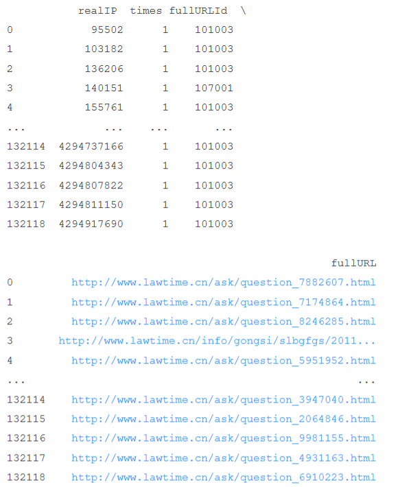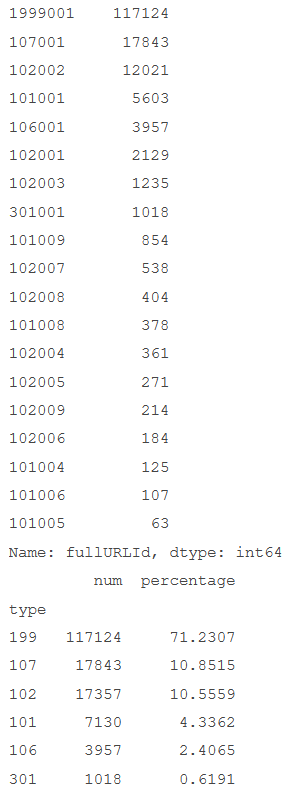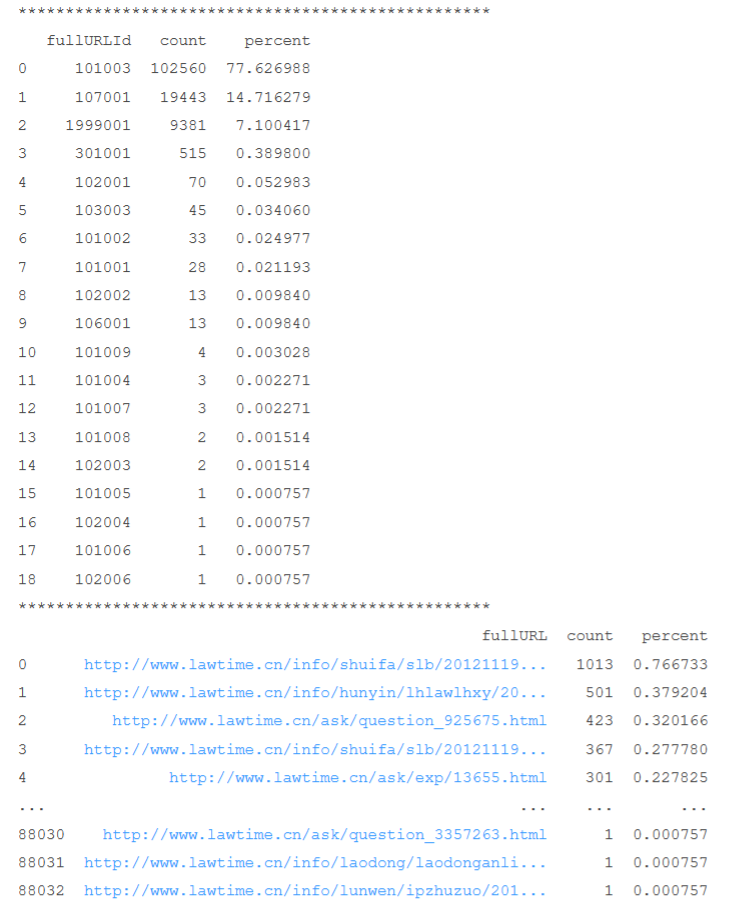 # 在浏览1次的前提下, 得到的网页被浏览的总次数 fullURL_count = pd.DataFrame(real_one.groupby("fullURL")["fullURL"].count()) fullURL_count.columns = ["count"] fullURL_count["fullURL"] = fullURL_count.index.tolist() fullURL_count.sort_values(by='count', ascending=False, inplace=True) # 降序排列 # 网页类型ID统计 fullURLId_count = merge_data['fullURLId'].value_counts() fullURLId_count = fullURLId_count.reset_index() fullURLId_count.columns = ['fullURLId', 'count'] fullURLId_count['percent'] = fullURLId_count['count'] / fullURLId_count['count'].sum() * 100 print('*****' * 10) print(fullURLId_count) # 用户点击一次 浏览的网页统计 fullURL_count = merge_data['fullURL'].value_counts() fullURL_count = fullURL_count.reset_index() fullURL_count.columns = ['fullURL', 'count'] fullURL_count['percent'] = fullURL_count['count'] / fullURL_count['count'].sum() * 100 print('*****' * 10) print(fullURL_count)