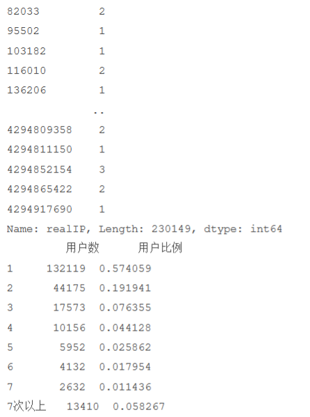 # 统计点击次数 engine = create_engine('mysql+pymysql://root:123456@127.0.0.1:3306/test?charset=utf8') sql = pd.read_sql('all_gzdata', engine, chunksize = 10000)# 分块读取数据库信息 counts1 = [i['realIP'].value_counts() for i in sql] # 分块统计各个IP的出现次数 counts1 = pd.concat(counts1).groupby(level=0).sum() # 合并统计结果,level=0表示按照index分组 print(counts1) counts1_ = pd.DataFrame(counts1) counts1_ counts1['realIP'] = counts1.index.tolist() counts1_[1]=1 # 添加1列全为1 hit_count = counts1_.groupby('realIP').sum() # 统计各个“不同点击次数”分别出现的次数 # 也可以使用counts1_['realIP'].value_counts()功能 hit_count.columns=['用户数'] hit_count.index.name = '点击次数' # 统计1~7次、7次以上的用户人数 hit_count.sort_index(inplace = True) hit_count_7 = hit_count.iloc[:7,:] time = hit_count.iloc[7:,0].sum() # 统计点击次数7次以上的用户数 hit_count_7 = hit_count_7.append([{'用户数':time}], ignore_index=True) hit_count_7.index = ['1','2','3','4','5','6','7','7次以上'] hit_count_7['用户比例'] = hit_count_7['用户数'] / hit_count_7['用户数'].sum() print(hit_count_7)