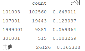 # 初始化数据库连接: engine = create_engine('mysql+pymysql://root:123456@localhost:3306/test?charset=utf8') sql = pd.read_sql('all_gzdata', engine, chunksize=1024 * 5) # 分块统计各个IP的点击次数 result = [i['realIP'].value_counts() for i in sql] click_count = pd.concat(result).groupby(level=0).sum() click_count = click_count.reset_index() click_count.columns = ['realIP', 'times'] # 筛选出来点击一次的数据 click_one_data = click_count[click_count['times'] == 1] # 这里只能再次读取数据 因为sql是一个生成器类型,所以在使用过一次以后,就不能继续使用了。必须要重新执行一次读取。 sql = pd.read_sql('all_gzdata', engine, chunksize=1024 * 5) # 取出这三列数据 data = [i[['fullURLId', 'fullURL', 'realIP']] for i in sql] data = pd.concat(data) # 和并数据 我以click_one_data为基准 按照realIP合并过来,目的方便查看点击一次的网页和realIP merge_data = pd.merge(click_one_data, data, on='realIP', how='left') # 点击一次的数据统计 写入数据库 以方便读取 校准无误 写入后就可以注释掉此句代码 #erge_data.to_sql('click_one_count', engine, if_exists='append') print(merge_data) # 统计排名前4和其他的网页类型 URL_count_4 = URL_count.iloc[:4,:] time = hit_count.iloc[4:,0].sum() # 统计其他的 URLindex = URL_count_4.index.values URL_count_4 = URL_count_4.append([{'count':time}], ignore_index=True) URL_count_4.index = [URLindex[0], URLindex[1], URLindex[2], URLindex[3], '其他'] URL_count_4['比例'] = URL_count_4['count'] / URL_count_4['count'].sum() print(URL_count_4)