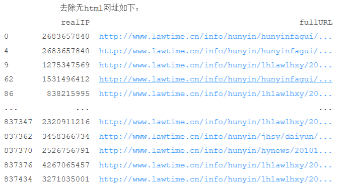 # 找出翻页和非翻页网址 index = [re.search('/\d+_\d+\.html',i)!=None for i in info1.loc[:,'fullURL']] index1 = [i==False for i in index] info1_1 = info1.loc[index,:] # 带翻页网址 info1_2 = info1.loc[index1,:] # 无翻页网址 # 将翻页网址还原 da = [re.sub('_\d+\.html','.html',str(i)) for i in info1_1.loc[:,'fullURL']] info1_1.loc[:,'fullURL'] = da # 翻页与非翻页网址合并 frames = [info1_1,info1_2] info2 = pd.concat(frames) # 或者 info2 = pd.concat([info1_1,info1_2],axis = 0) # 默认为0,即行合并 # 去重(realIP和fullURL两列相同) info3 = info2.drop_duplicates() # 将IP转换成字符型数据 info3.iloc[:,0] = [str(index) for index in info3.iloc[:,0]] info3.iloc[:,1] = [str(index) for index in info3.iloc[:,1]] print(info3) len(info3)